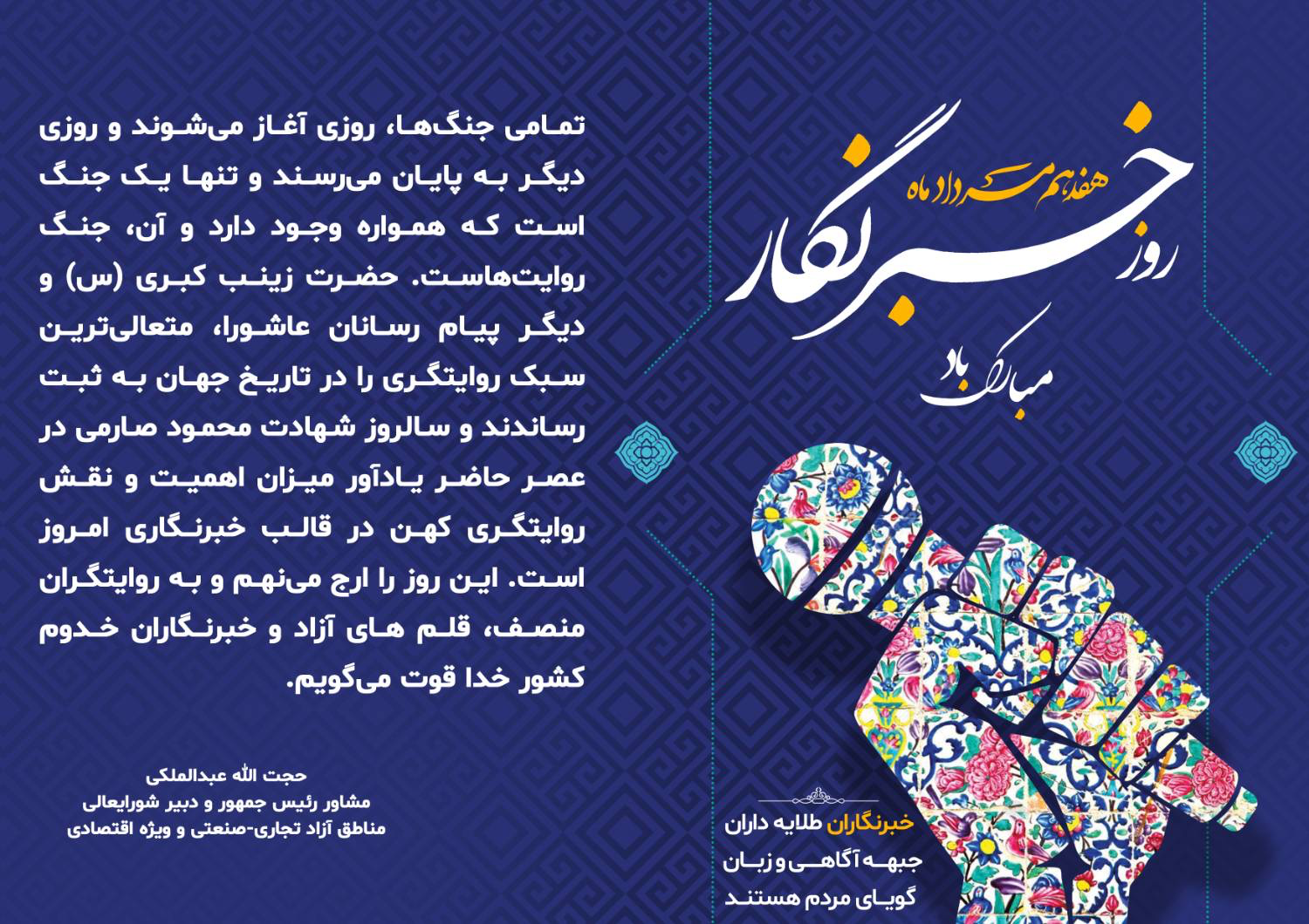 به گزارش روابط عمومی و اموربین الملل دبیرخانه شورایعالی مناطق آزاد و ویژه اقتصادی، حجت الله عبدالملکی در متن پیام تبریک روز خبرنگار آورده است: